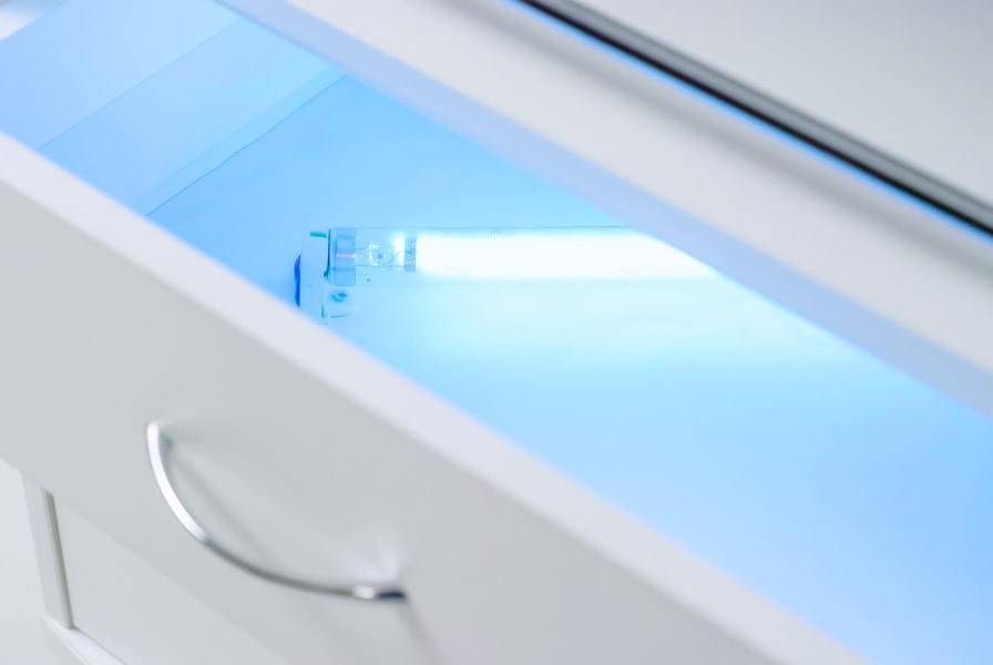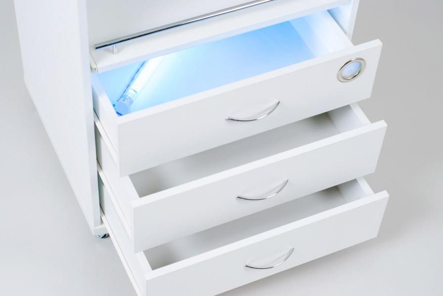 Тумба Италика является стильной и многофункциональной моделью. В отличие от своих аналогов она имеет УФ-модуль и выдвижную полку, а также увеличенную рабочую поверхность. Это позволяет рационально разместить все оборудование и инструменты мастера в одном месте. Тележка оснащена резиновыми колесиками, которые позволяют бесшумно и легко перемещать ее по любой поверхности.