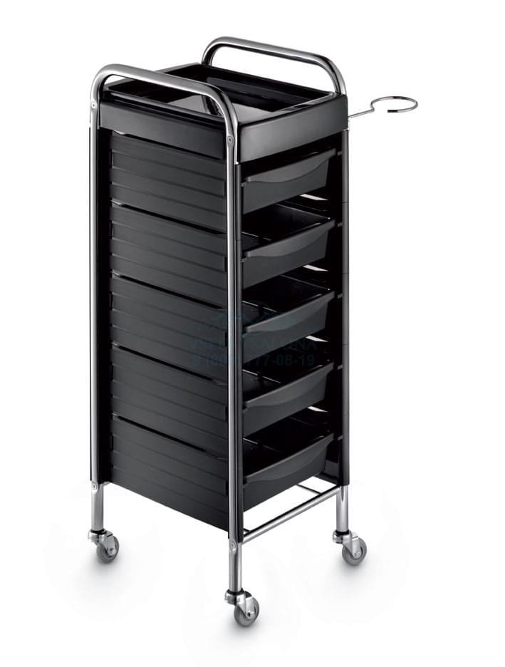 Тележка парикмахерская выполнена из пластика, на колесиках, с выдвижными ящиками и закрывающейся на ключ дверцей. Цвет серый, черный.