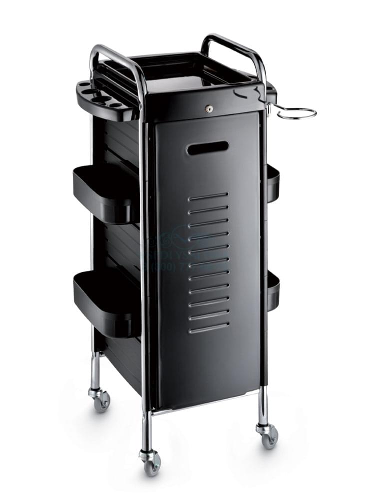 Парикмахерская тележка Т-30 оснащена глубокими и вместительными ящиками для парикмахерских принадлежностей, а также фенодержателем для еще большего удобства работы. Она выполнена в классическом черном цвете, что делает ее универсальной моделью практически для любой современной парикмахерской или барбершопа.