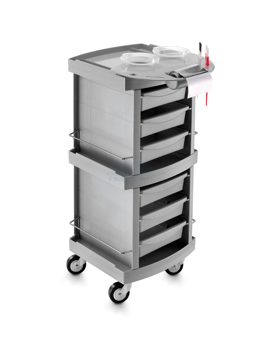 Тележка парикмахерская выполнена из пластика, на колесиках, с выдвижными ящиками. Цвет серый, черный. Размер (ДхШхВ): 38.5х52х90