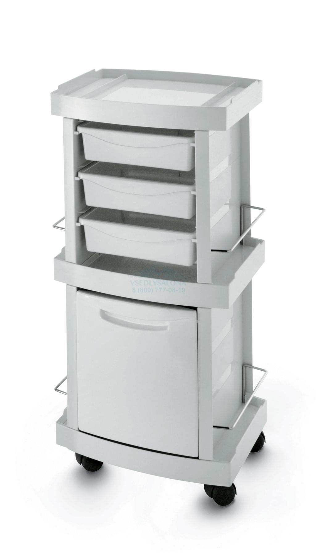 Тележка парикмахерская выполнена из белого пластика, на колесиках, с выдвижными ящиками. Размер (ДхШхВ): 39х39х86
