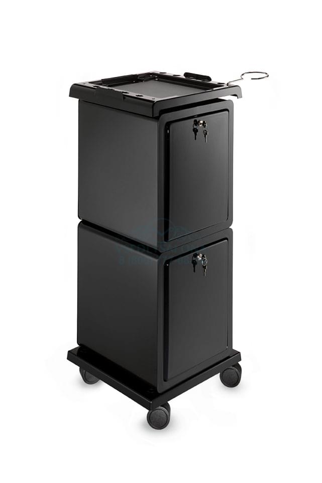 Тележка парикмахерская выполнена из пластика, на колесиках, с выдвижными ящиками и дверцами, закрывающимися на ключ. Цвет черный, белый, серый, красный