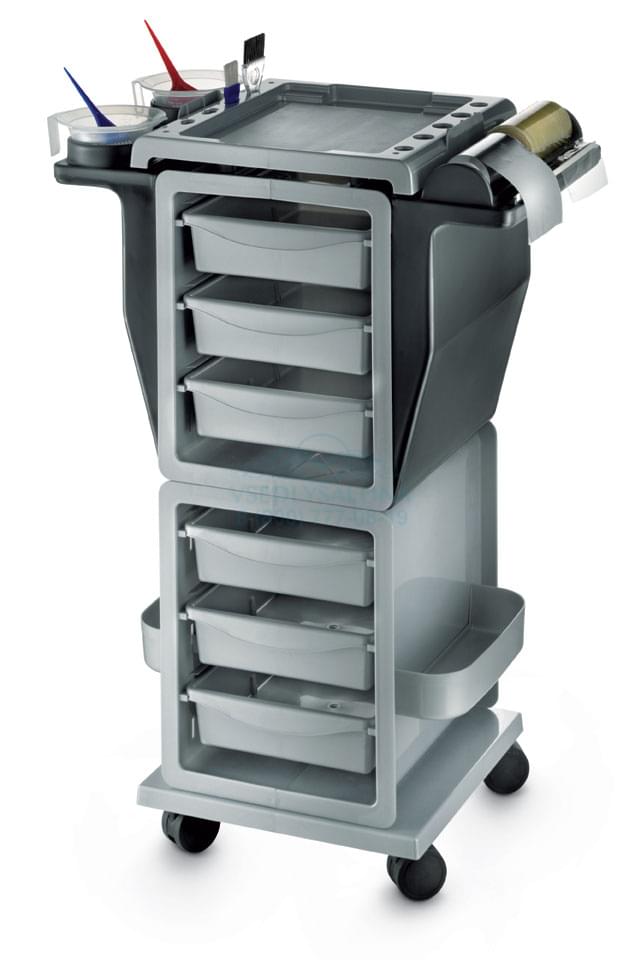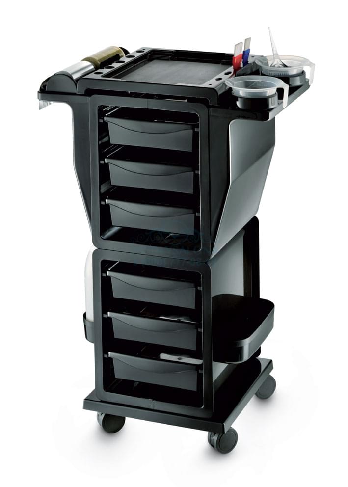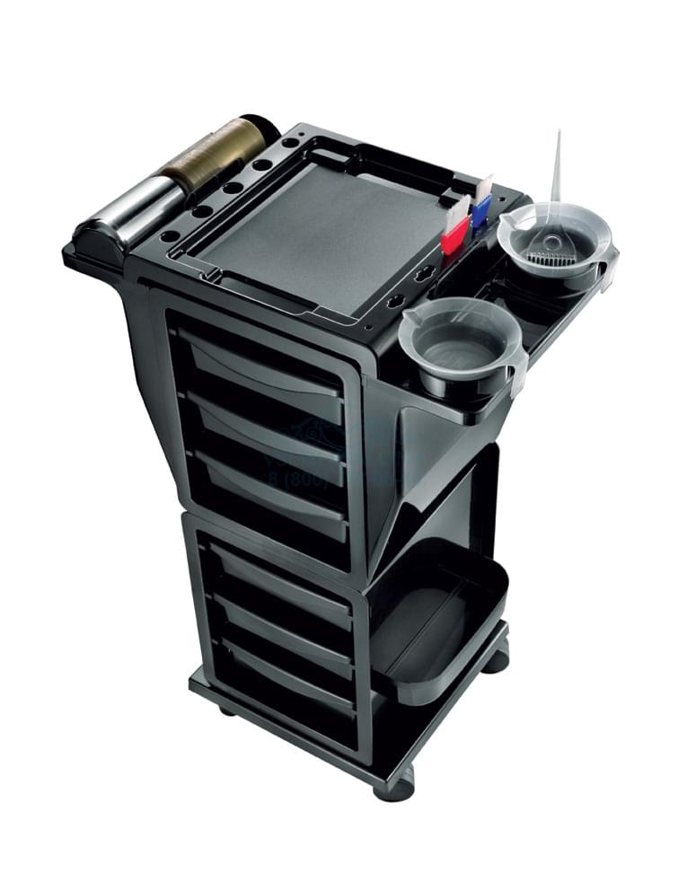 Тележка парикмахерская выполнена из пластика, на колесиках, с выдвижными ящиками. Цвет: чёрный, серебро