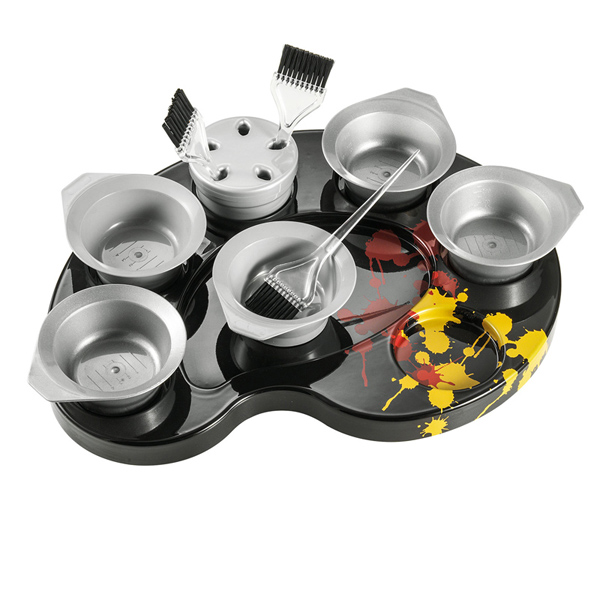 Тележка для окрашивания "PALETTE COLOR SPLASH" - тележка с артикулом A-м60003006 из пластика на колесах. Имеет 5 отделений под миски для окрашивания, 5 отделений под кисти и отделение для сопутствующих аксессуаров. Отличительной особенностью тележки является наличие декортаивного рисунка в виде кляксы.
