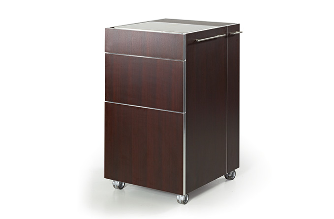 Модель имеет несколько выдвижных ящиков, а также отделений с распашными дверцами. Мобильность тумбы достигается за счет наличия бесшумных колесиков. В комплектацию входит холодильник, нагреватель для полотенец, нагревательная плита. Данная модель – один из лучших вариантов сочетания функциональности, стильного дизайна и отменного качества.